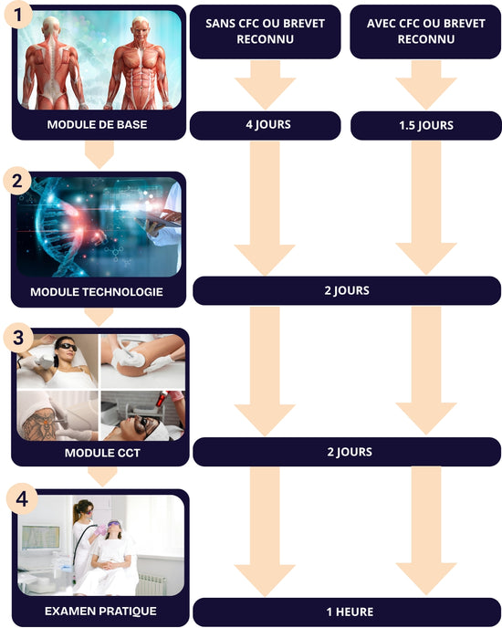 Le module de base dépend de votre diplôme. Si vous avez un CFC ou un Brevet fédéral en esthétique, vous pouvez suivre la version accélérée (1,5 jour au lieu de 4). Sinon, la version complète est obligatoire.