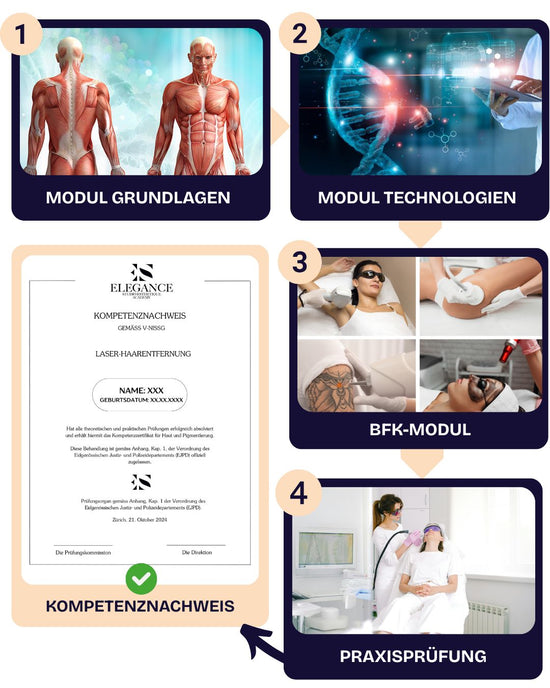Elegance Studio Esthétique GmbH ist ein schweizweit anerkanntes Ausbildungsinstitut, das auf kosmetische Technologien – besonders auf Laserbehandlungen – spezialisiert ist. Wir schulen Kosmetikerinnen in der sicheren und gesetzeskonformen Anwendung von Geräten, gemäss den Vorgaben des BAG. Unsere Kurse führen zum Sachkundenachweis gemäss V-NISSG, der für die Berufsausübung in der Schweiz erforderlich ist.